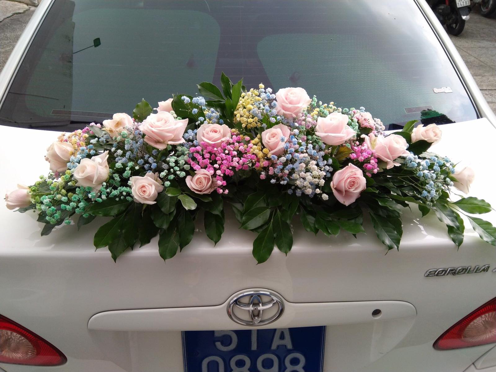 Hoa trên xe cưới mẫu nằm sau xe